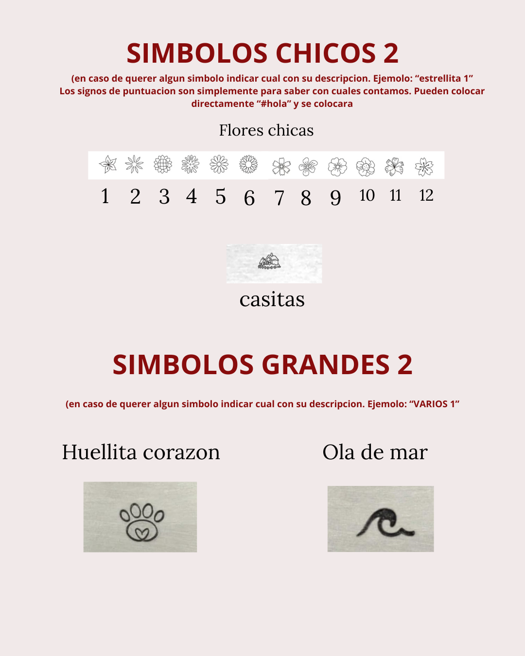 IMPORTANTE: los simbolos debes escribirlos con palabras por ejemplo: "corazon basico grande" ya que si ponene el emoji de corazon "❤️" hay veces que NO QUEDA GRABADO. Por favor poner con palabras para evitar errores.