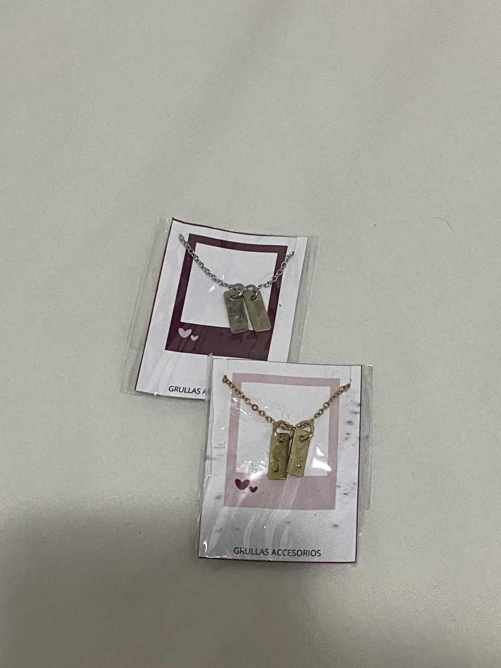 Collar plateado con cadena de acero quirúrgico y 2 dijes artesanales rectangulares personalizados grabados con iniciales de alpaca.